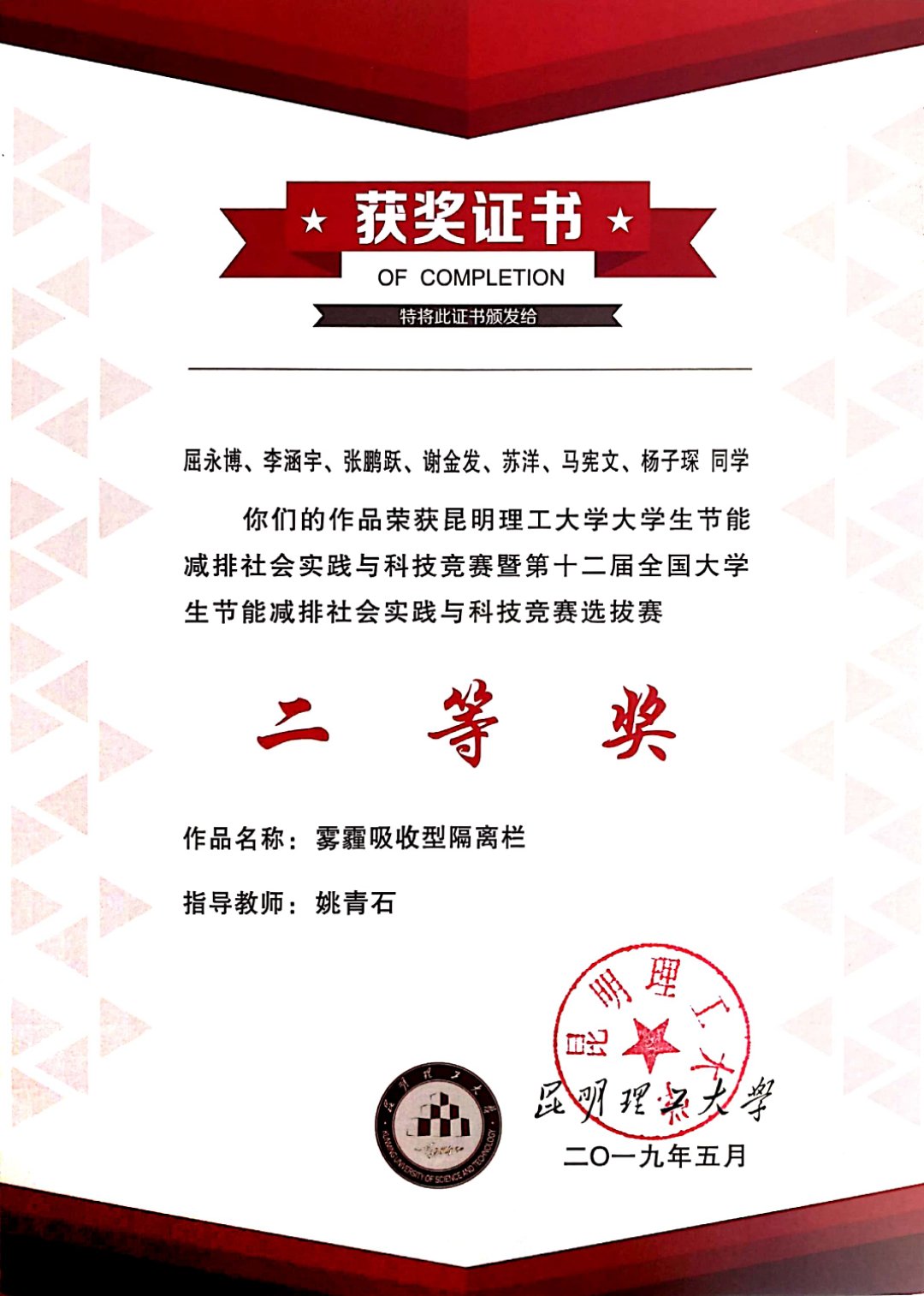 大学生节能减排社会实践与科技竞赛暨第十二届全国大学生节能减排社会实践与科技竞赛选拔赛二等奖。
