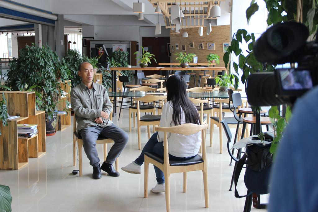 9月22日上午,云南电视台记者在建筑楼中庭“建筑客厅”对h漫