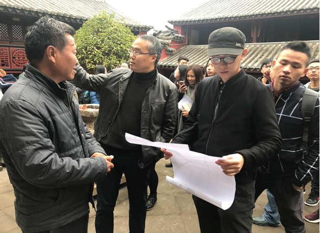 开题教学结束后,四校师生深入昆明市呈贡区乌龙村,当地村委书记为四校师生详细介绍了乌龙村的历史沿革、产业结构、人口问题以及未来的发展规划。随后村委书记和村委会负责人的带领和介绍下,四校师生走遍整个乌龙村,对该村的古建筑、民居、古树名木等有了更直接的了解,并进行现场调研和资料收集。