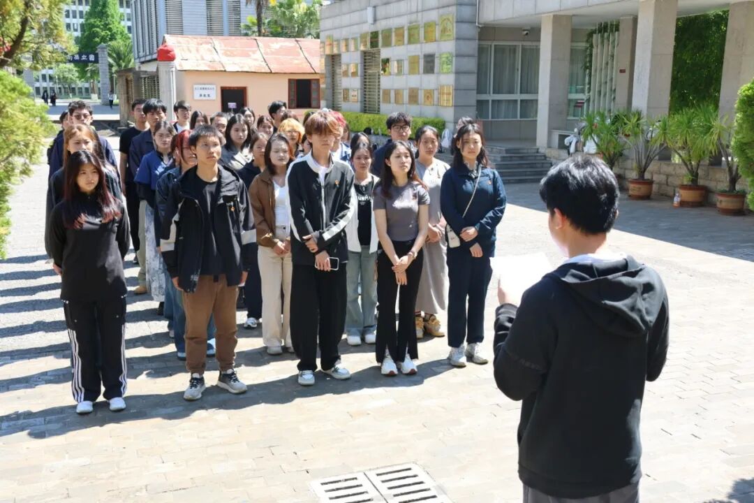 参观结束后,全体学员列队前往纪念广场,举行庄重的献花仪式。大家手持菊花,缓步走向纪念雕塑,以整齐的队形、肃穆的姿态,向革命先辈与联大先贤敬献鲜花。献花过程庄严肃穆,让学员们在仪式感中深化对历史的敬畏,厚植家国情怀。