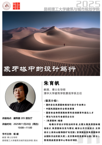 博导、中国风景园林学会常务理事、景观学系系主任朱育帆教授为全院师生带来了一场题为“象牙塔中的设计笃行——专业经历的批判性回顾”的专题讲座,讲座作为“新时代风景园林学科发展与教育前瞻”学术周的重要组成部分,学院院长杨毅教授主持讲座,学院党委钟金栋书记和毛志睿副院长、教师代表以及部分学生共80余人聆听了讲座。